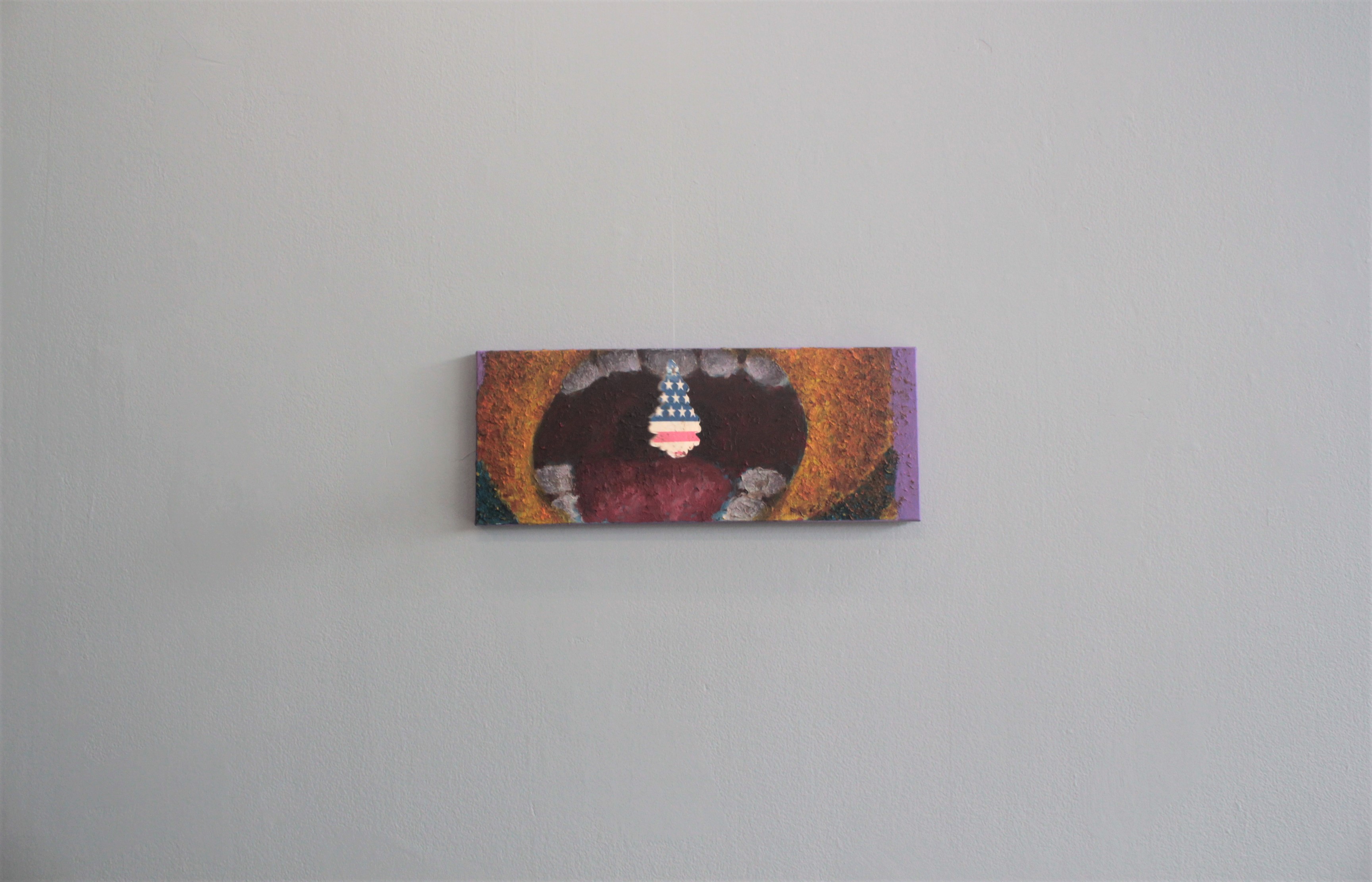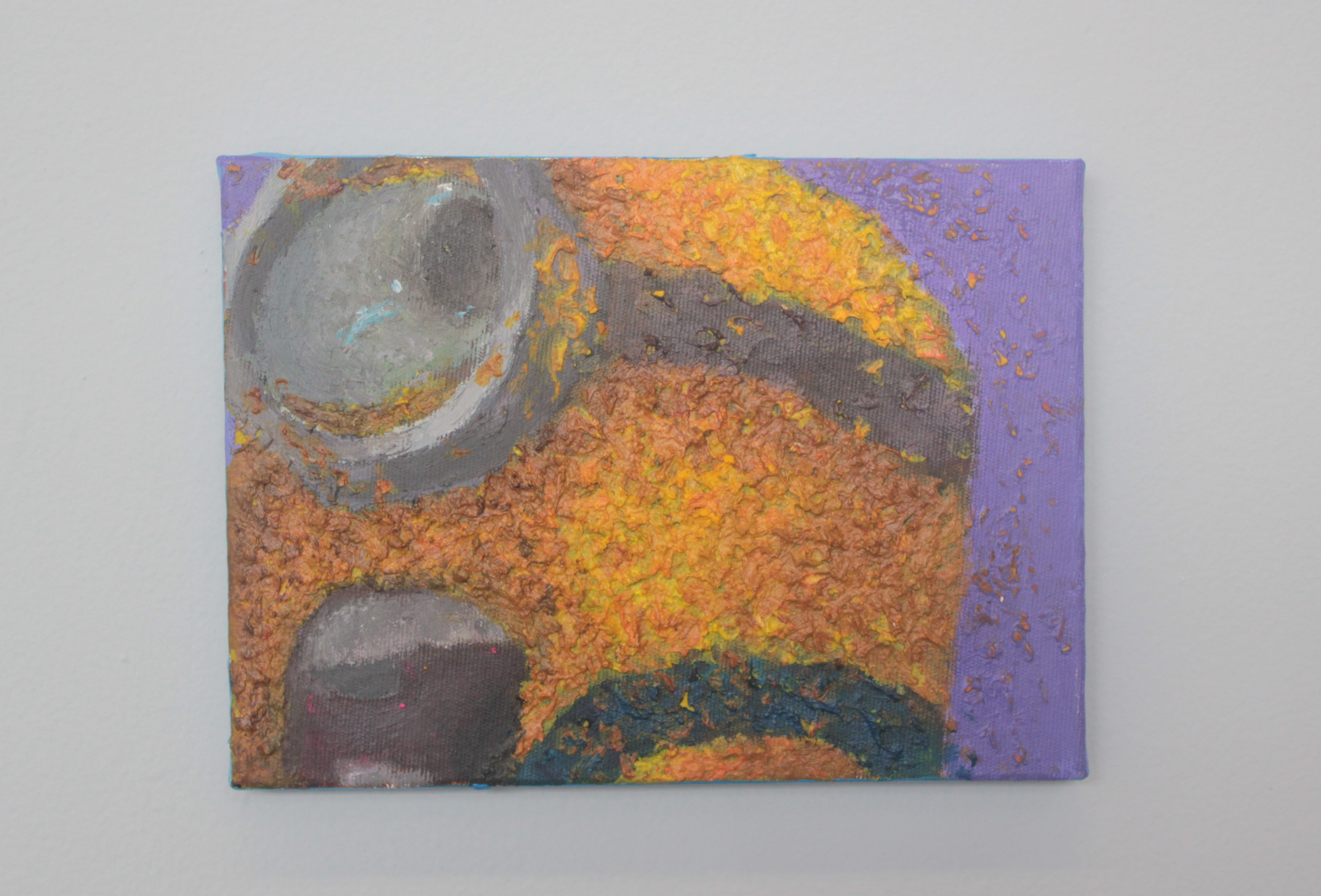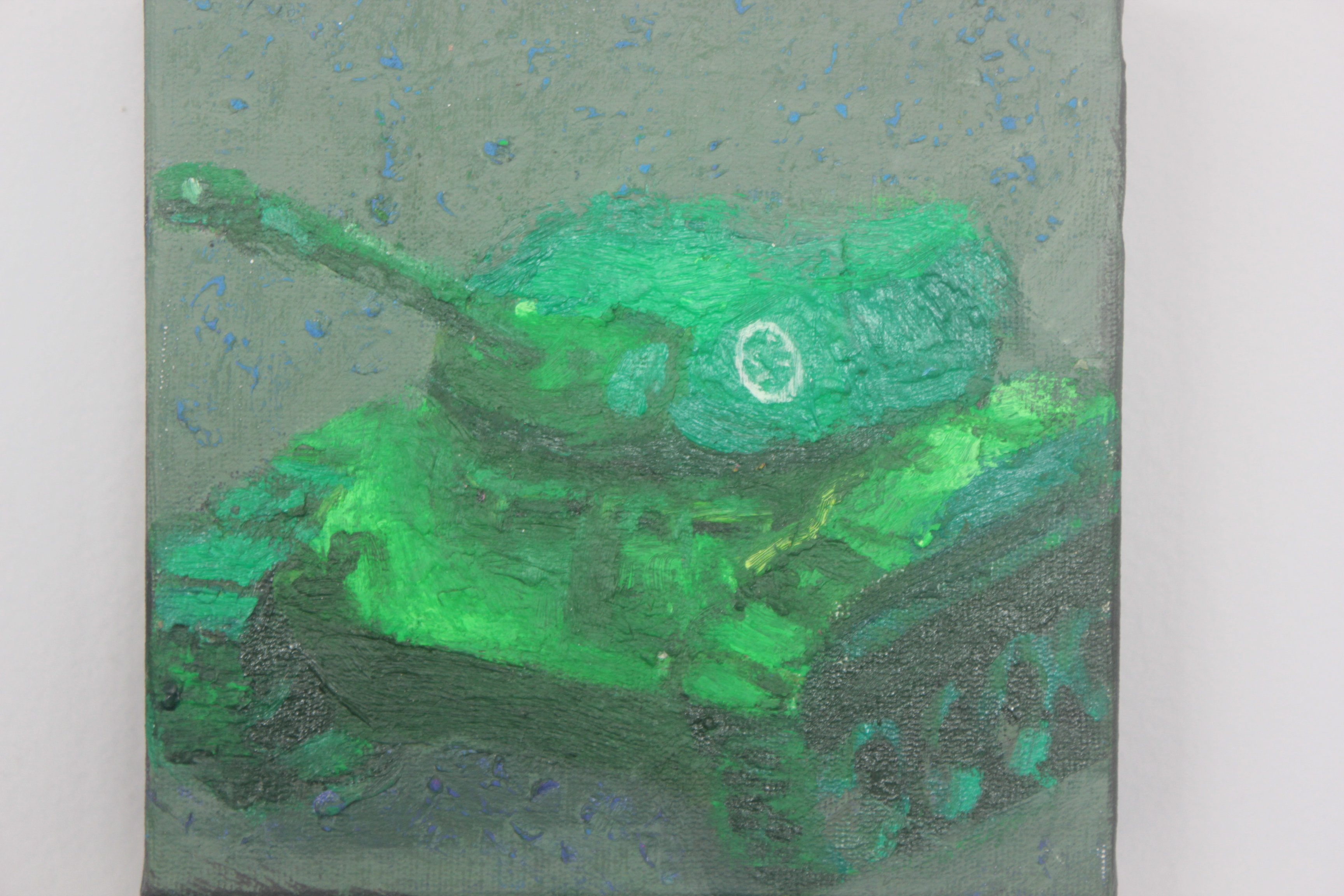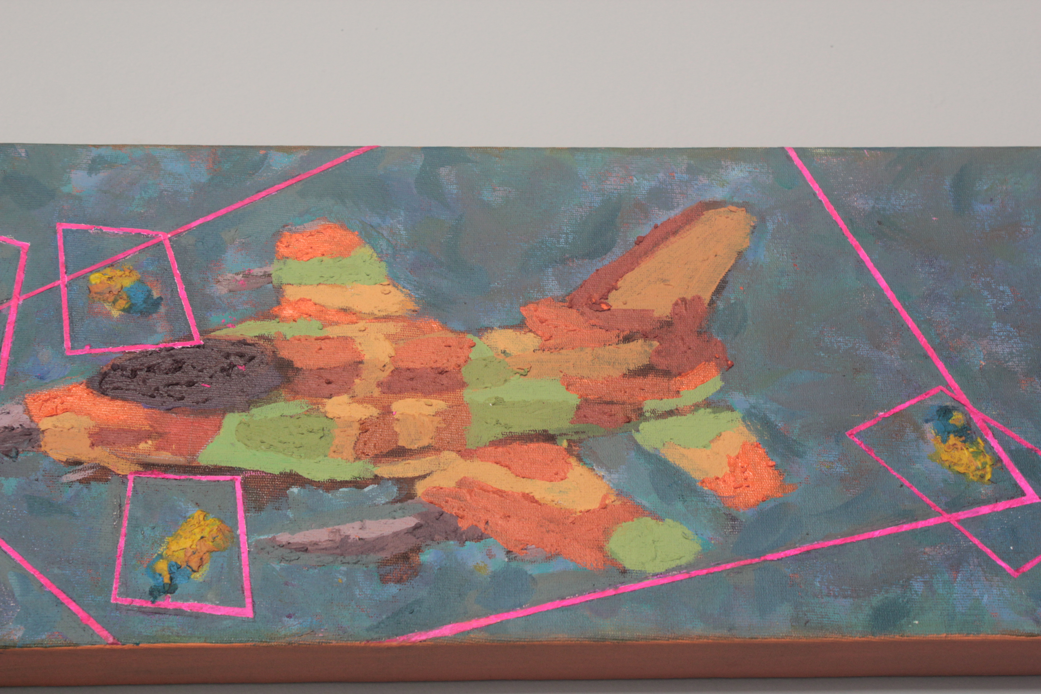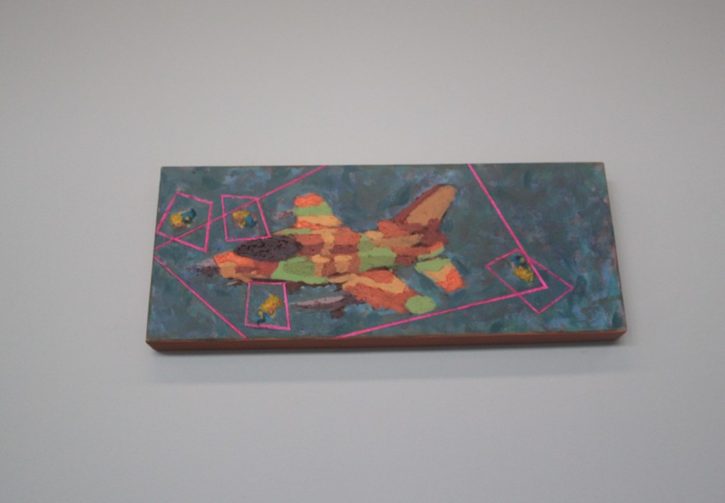 Ponderando a respeito da elaboração relacional entre trabalhos, um dos percursos observados é o da disposição vertical cima-baixo, respectivamente, da pintura do avião-bombardeiro e a do minion ao fundo roxo. Cada peça de arte produz um recorte na parede, que exibe fragmentos de uma mesma cena totalizada. Nisso, o minion mais abaixo desta disposição reage ambiguamente ao caça padronizado como aos de Israel, disparando sequencialmente outras mais figuras amarelas de jeans. Em uma mesma situação, o minion é vítima daquele terrorismo ao mesmo tempo em que é arma. Considera-se, nesta situação da pintura à cima-direita, o minion também como uma arma ideológica a colidir em território inimigo. O imperialismo cultural estadunidense como estratégia de devastação e dominação.