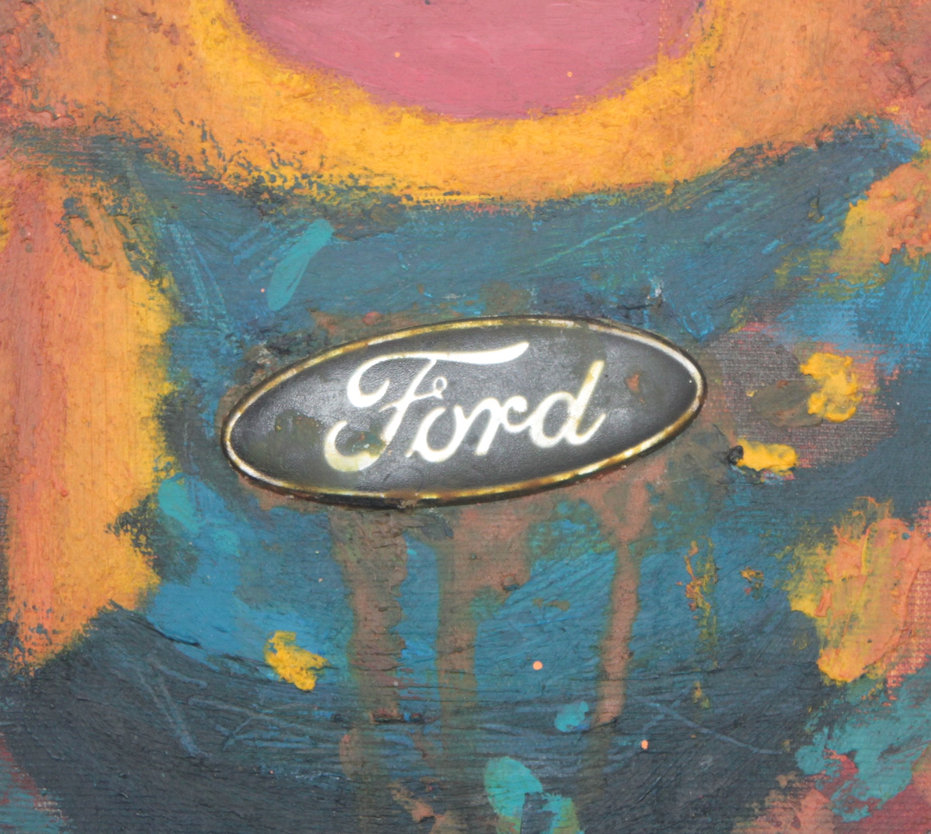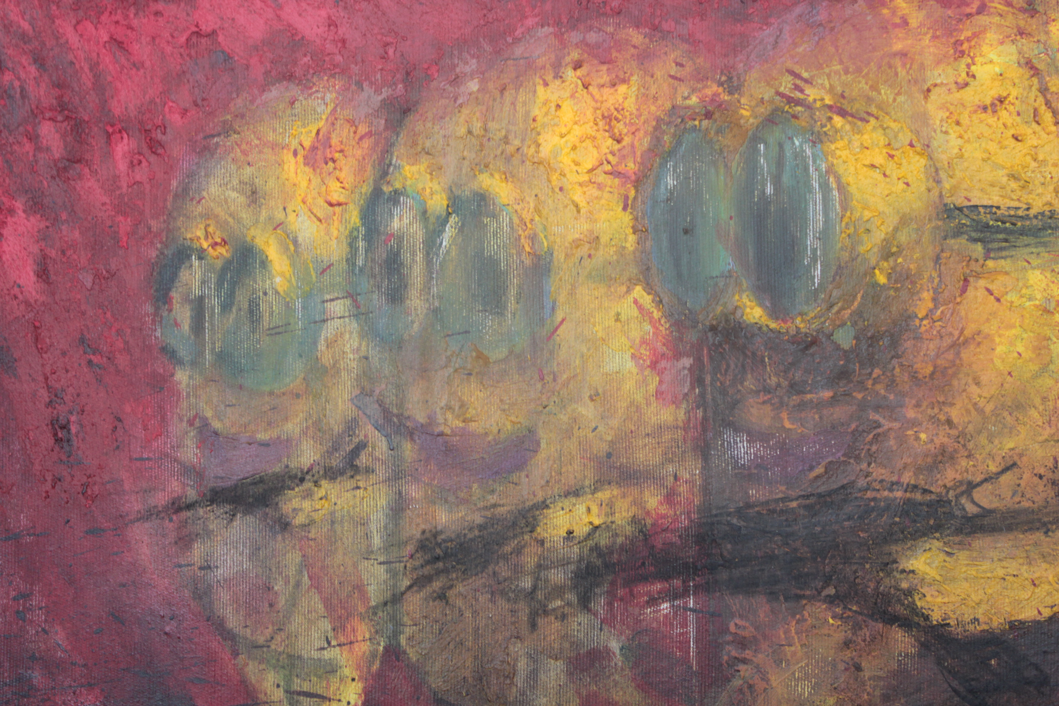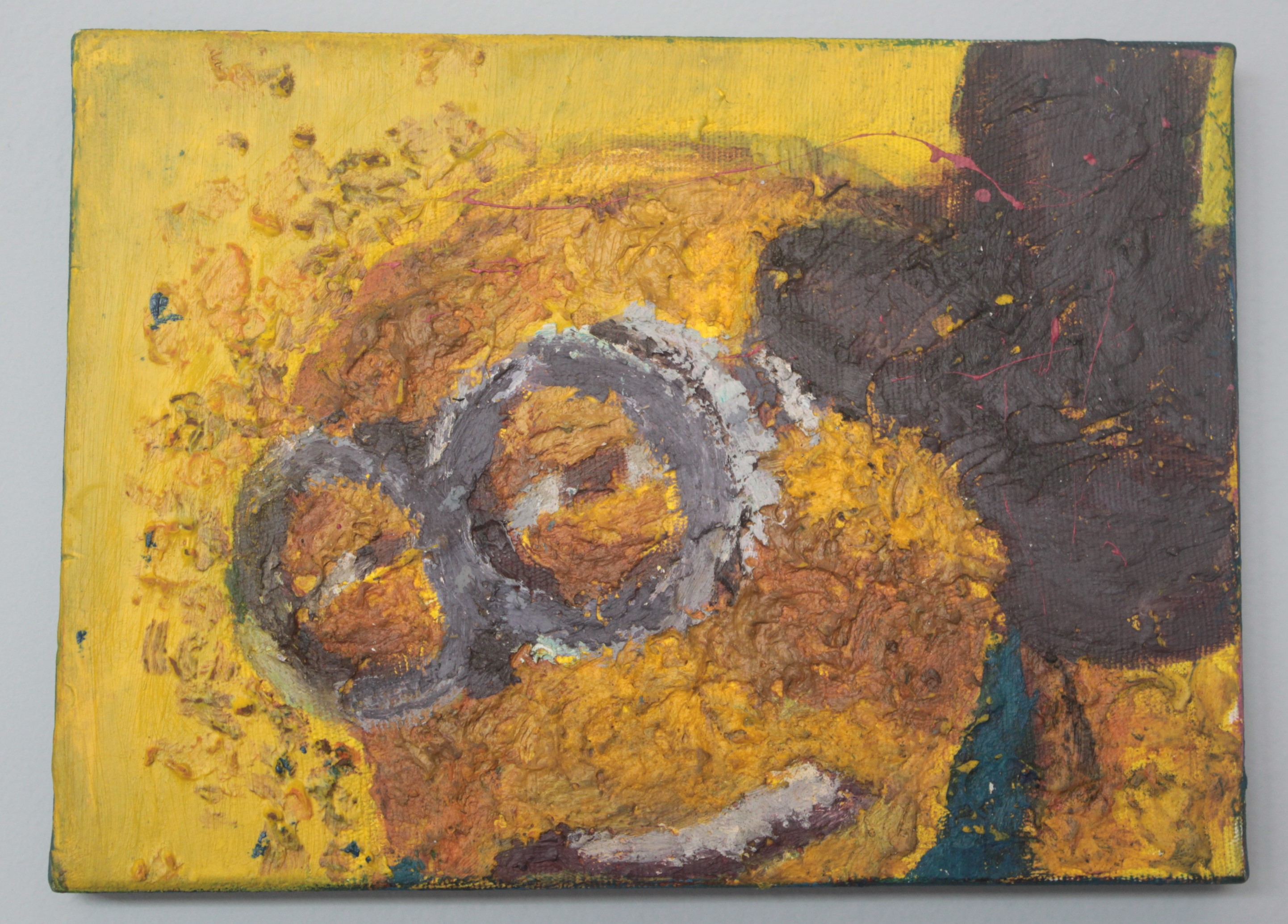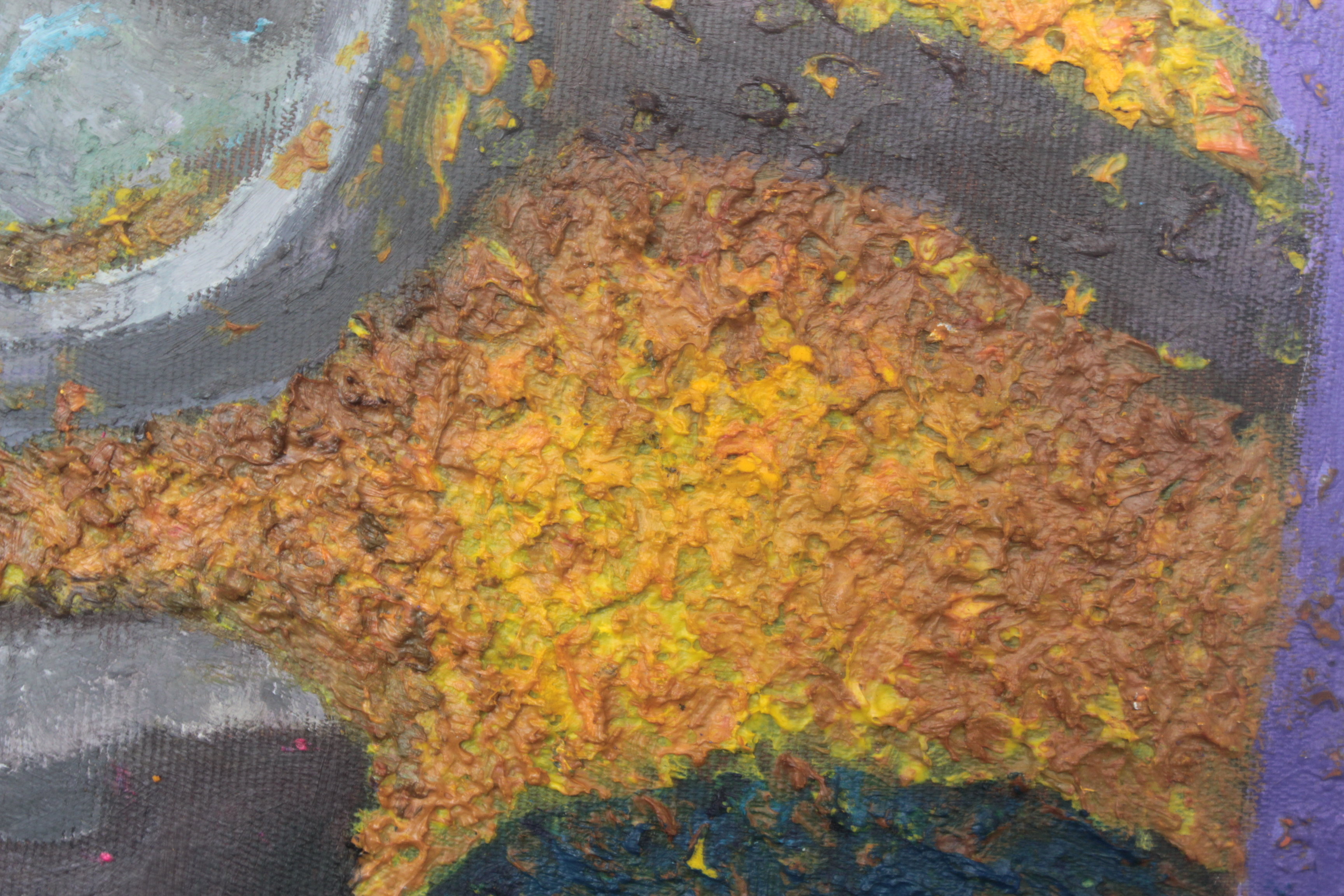Ponderando a respeito da elaboração relacional entre trabalhos, um dos percursos observados é o da disposição vertical cima-baixo, respectivamente, da pintura do avião-bombardeiro e a do minion ao fundo roxo. Cada peça de arte produz um recorte na parede, que exibe fragmentos de uma mesma cena totalizada. Nisso, o minion mais abaixo desta disposição reage ambiguamente ao caça padronizado como aos de Israel, disparando sequencialmente outras mais figuras amarelas de jeans. Em uma mesma situação, o minion é vítima daquele terrorismo ao mesmo tempo em que é arma. Considera-se, nesta situação da pintura à cima-direita, o minion também como uma arma ideológica a colidir em território inimigo. O imperialismo cultural estadunidense como estratégia de devastação e dominação.