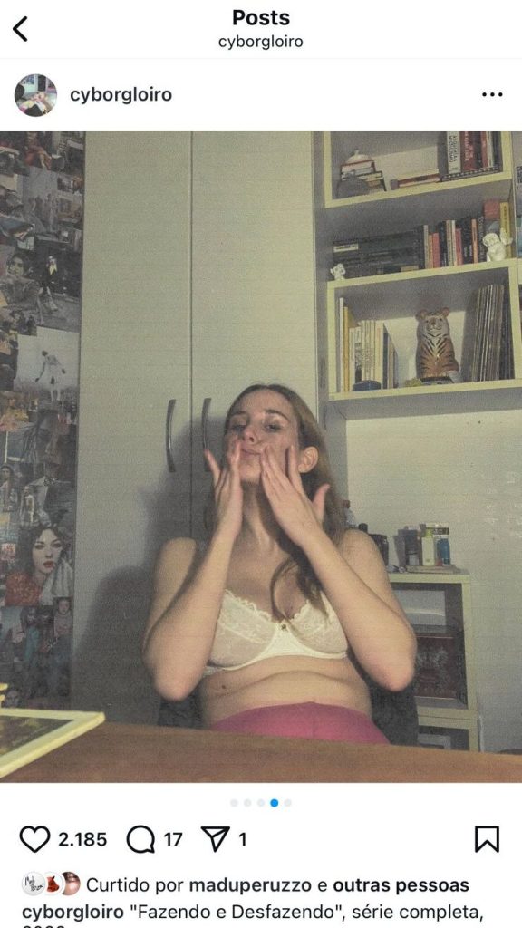 Não sobre performance, mas sim sobre performatividade, a construção artística de um é de Helena Bohn com Cyborgloiro sugere uma perspectiva extremamente contemporânea acerca da subjetividade no mundo web. A pesquisa em arte através da NetArt de Bohn explora os moldes massificados controlados por algoritmos no Instagram, a fim de desdobrar questões acerca das imagens e autorrepresentações femininas. O constante acesso ao cotidiano de estranhos por meio das redes sociais provocou um falso senso de intimidade entre os usuários de internet. Helena Bohn se insere nesse contexto, porém sempre evidenciando o distanciamento real entre seus seguidores. O próprio fato de termos contato apenas com uma reprodução à 3 graus de distância da imagem original impõe este isolamento. O observado é a fotografia da impressão em sulfite, rearranjada em pixels em nossos celulares. Ainda que a temática da intimidade transpareça na produção da artista, sua forma proclama a real alienação sob Cyborgloiro.